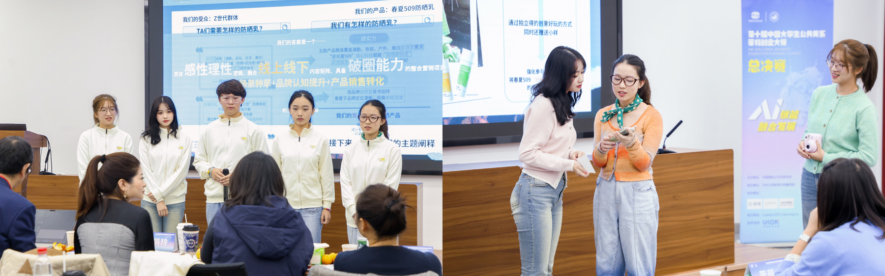 团队围绕自然堂“春夏针对 Z 世代群体‘全场景防晒系列’”选题展开策划,从公共关系的专业视角出发,创新性加入情景演绎环节,还原 Z 世代在日常通勤、户外运动、旅游打卡等场景下的防晒需求,将方案中的“全场景传播”策略具象化呈现,让抽象的公关逻辑变得直观易懂。这既展现了团队对公关关系策划的深刻理解,又增强了汇报阐述的感染力与记忆点。此方案成熟度高、公关思维突出、逻辑框架清晰的优势,搭配情景演绎的巧思设计,收获评委高度认可。
